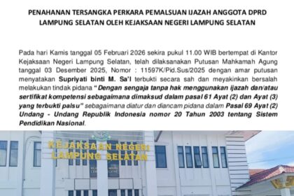 KALIANDA — Kejaksaan Negeri (Kejari) Lampung Selatan resmi melaksanakan eksekusi putusan Mahkamah…