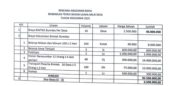 Berdasarkan dokumen Rencana Anggaran Biaya (RAB) yang diperoleh media, Bimtek ini diikuti oleh 16 desa dengan total anggaran mencapai Rp40.000.000, atau setara Rp2.500.000 per desa. Sorotan muncul lantaran kegiatan ini digelar di tengah belum terealisasinya sejumlah kewajiban desa, seperti pembayaran honor Linmas tingkat RT dan kader desa.