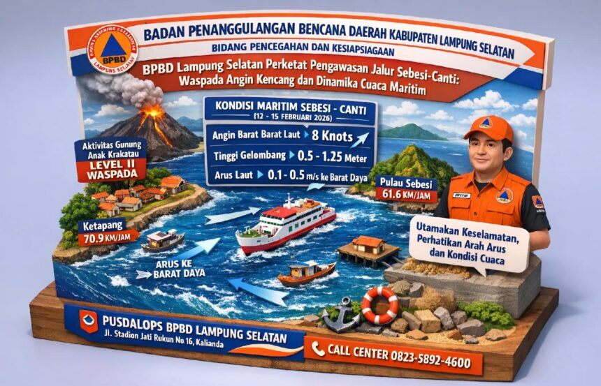 LAMPUNG INDONESIA.Com,KALIANDA, 11 Februari 2026 — Pemerintah Kabupaten Lampung Selatan melalui Bidang Pencegahan dan Kesiapsiagaan BPBD merilis laporan kondisi wilayah serta peringatan dini cuaca untuk periode 11–15 Februari 2026. Fokus utama diarahkan pada potensi angin kencang di daratan serta keselamatan pelayaran rakyat di jalur laut Sebesi–Canti.