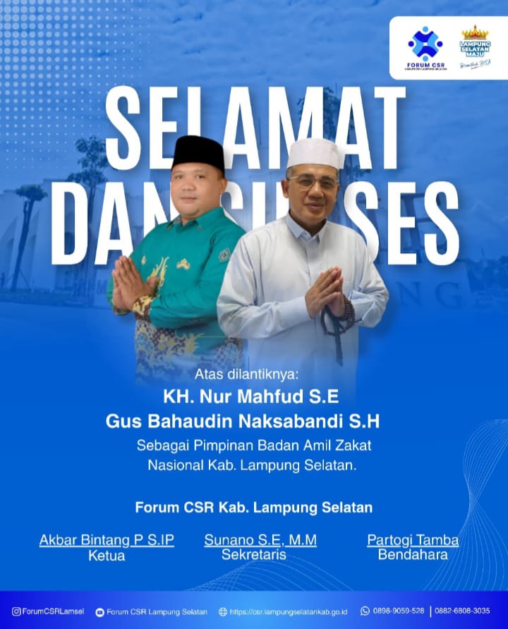 LampungID.Com, Lampung Selatan — Forum Corporate Social Responsibility (CSR) Kabupaten Lampung Selatan menyampaikan ucapan selamat dan sukses atas dilantiknya KH. Nur Mahfud, S.E. dan Gus Bahaudin Naksabandi, S.H. sebagai pimpinan Badan Amil Zakat Nasional Kabupaten Lampung Selatan.