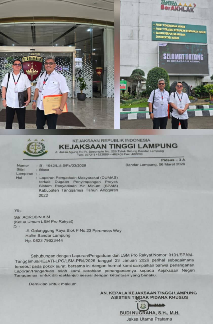 Pelimpahan itu tertuang dalam surat Kejaksaan Tinggi Lampung kepada LSM PRO RAKYAT Nomor B-1842/L.8.5/Fs/03/2026 tanggal 6 Maret 2026, yang ditandatangani Asisten Tindak Pidana Khusus Kejati Lampung, Budi Nugraha, S.H., M.H.