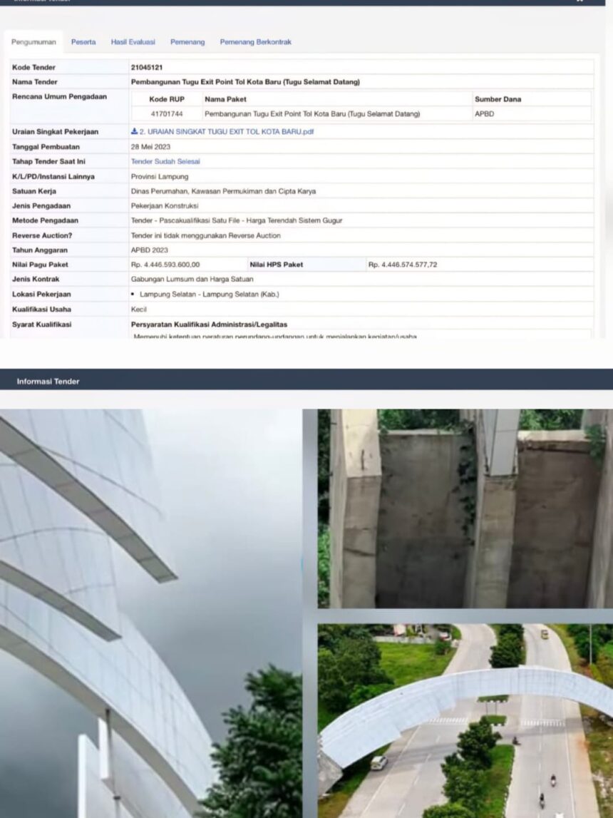 Berdasarkan penelusuran data tender pada sistem SPSE/Inaproc, paket pekerjaan tersebut tercatat dengan Kode Tender 21045121 dan Kode RUP 41701744, dengan nama paket “Pembangunan Tugu Exit Point Tol Kota Baru (Tugu Selamat Datang)”. Paket ini berada di bawah kewenangan Pemerintah Provinsi Lampung, pada Satuan Kerja/pemilik kegiatan Dinas Perumahan, Kawasan Permukiman dan Cipta Karya Provinsi Lampung.
