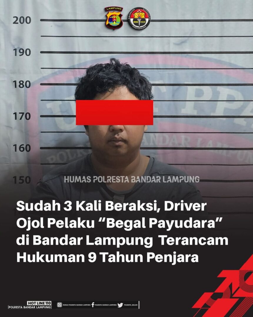 LampungID.Com, Bandar Lampung – Seorang pengemudi ojek online (ojol) berinisial MD (29), warga Kecamatan Sukabumi, terancam hukuman maksimal sembilan tahun penjara setelah melakukan aksi pelecehan seksual atau yang dikenal dengan istilah “begal payudara” terhadap seorang perempuan di wilayah Kecamatan Kedaton, Jumat (10/4/2026).