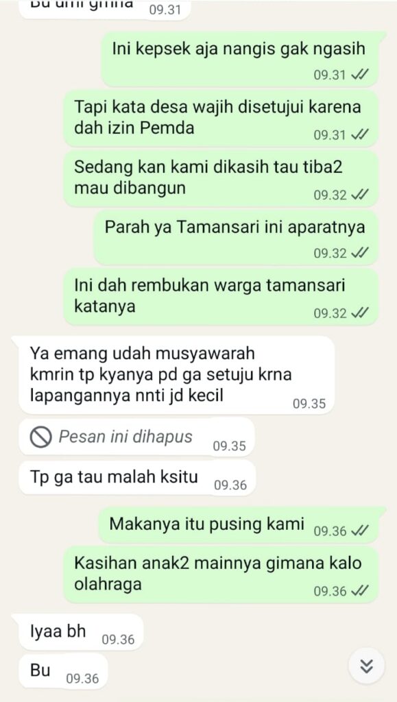 Di grup WhatsApp wali murid, penolakan juga menguat. Para orang tua menilai lokasi pendidikan tidak pantas dijadikan tempat usaha, terlebih bila prosesnya tidak transparan.