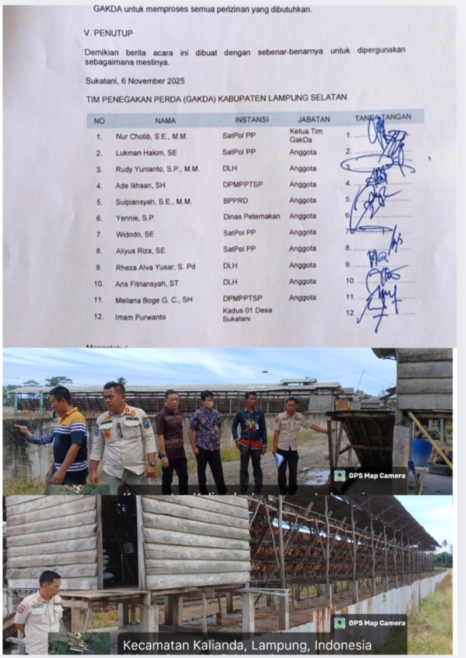LAMPUNGID.Com,Lampung Selatan — Tim Penegak Peraturan Daerah (Gakda) Kabupaten Lampung Selatan pada Kamis (06/11/2025) melakukan peninjauan dan verifikasi lapangan terhadap peternakan ayam milik Harun Efendi di Dusun Sukajadi, Desa Sukatani, Kecamatan Kalianda.